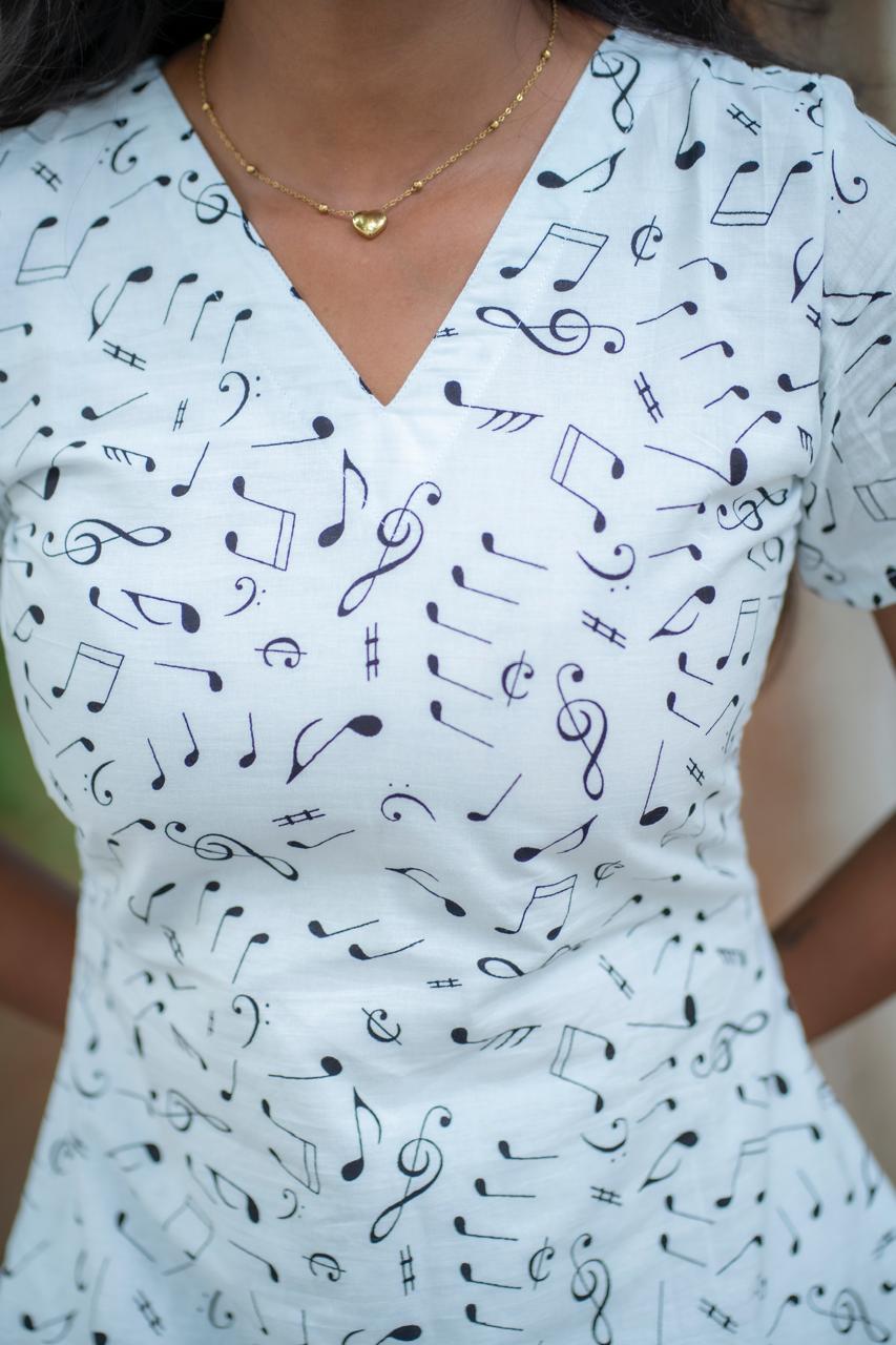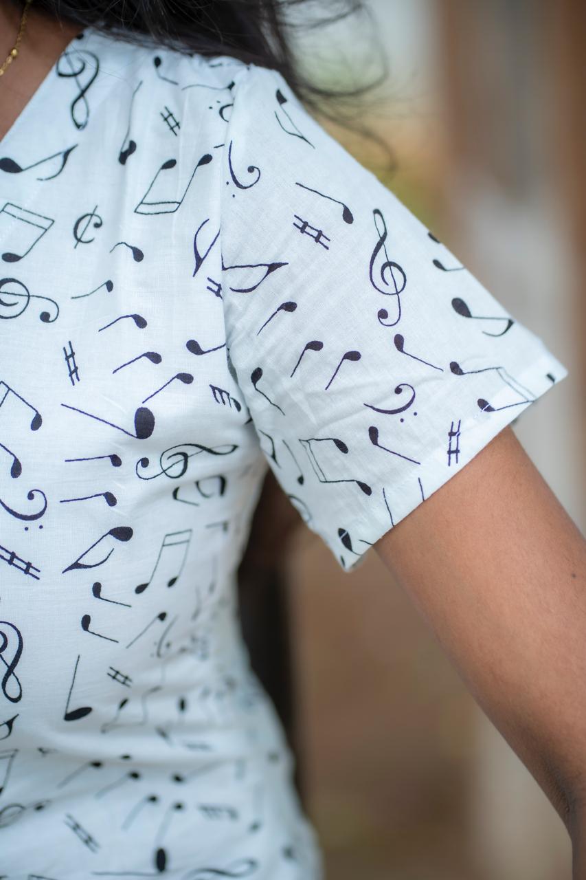 white top with musical prints isn’t just fashion — it’s a lyrical mood. With every note dancing on soft white fabric, it reflects the calm beauty of a song before the high notes hit.
