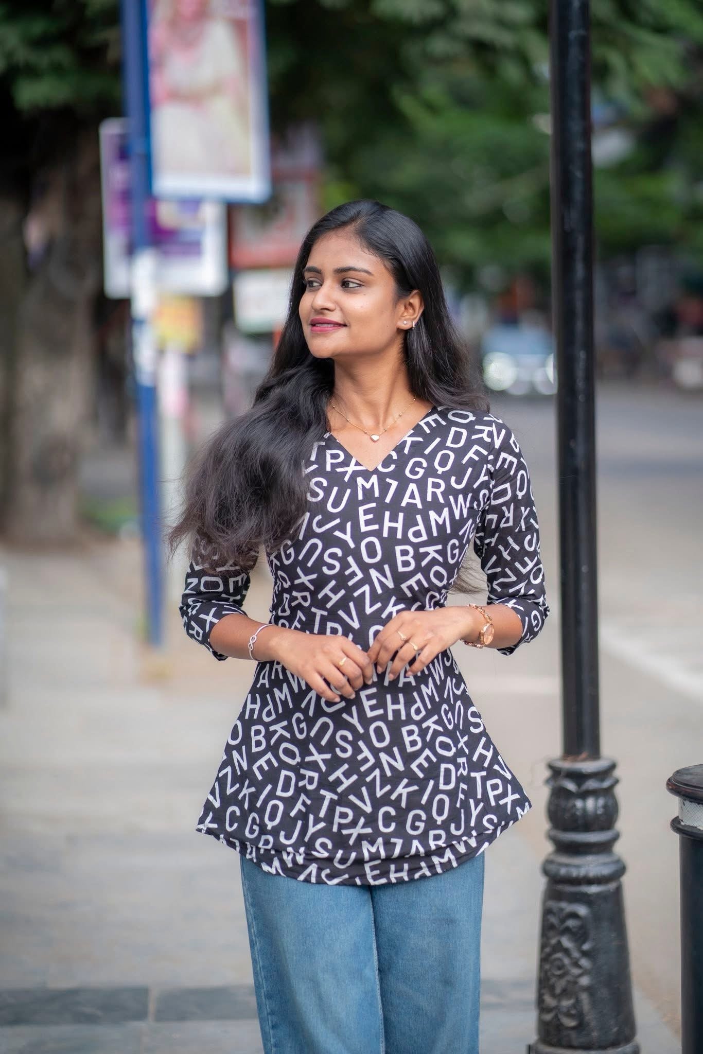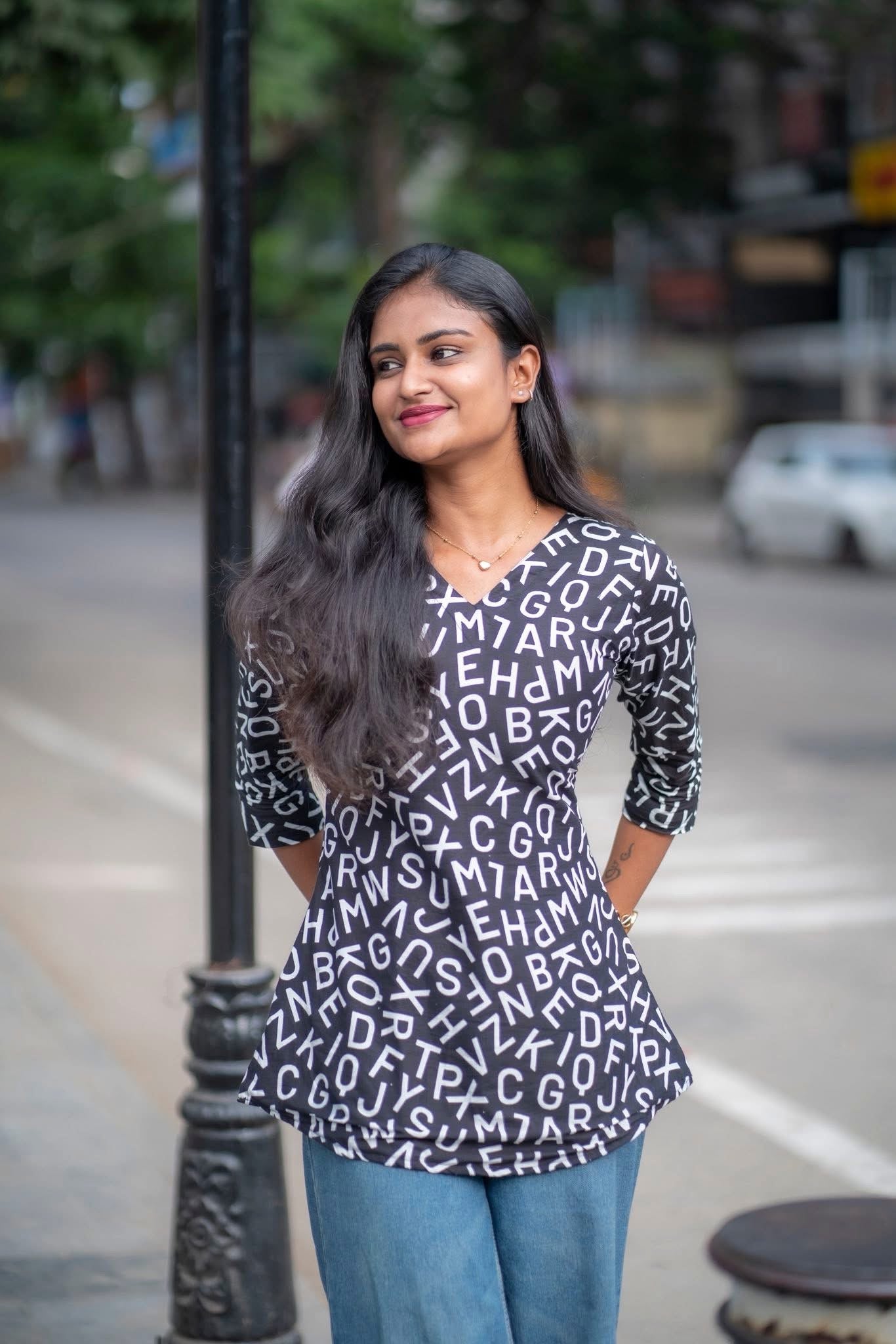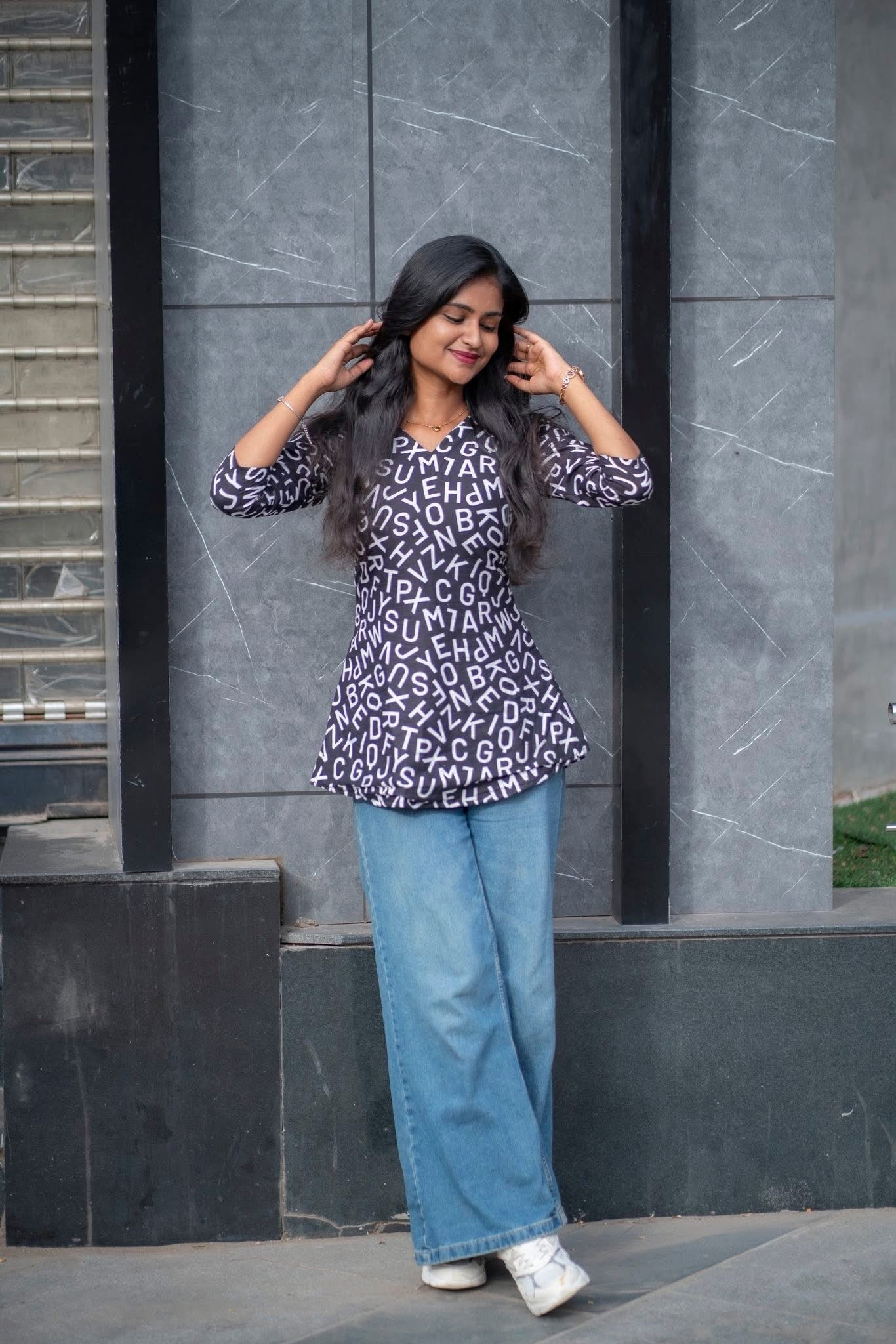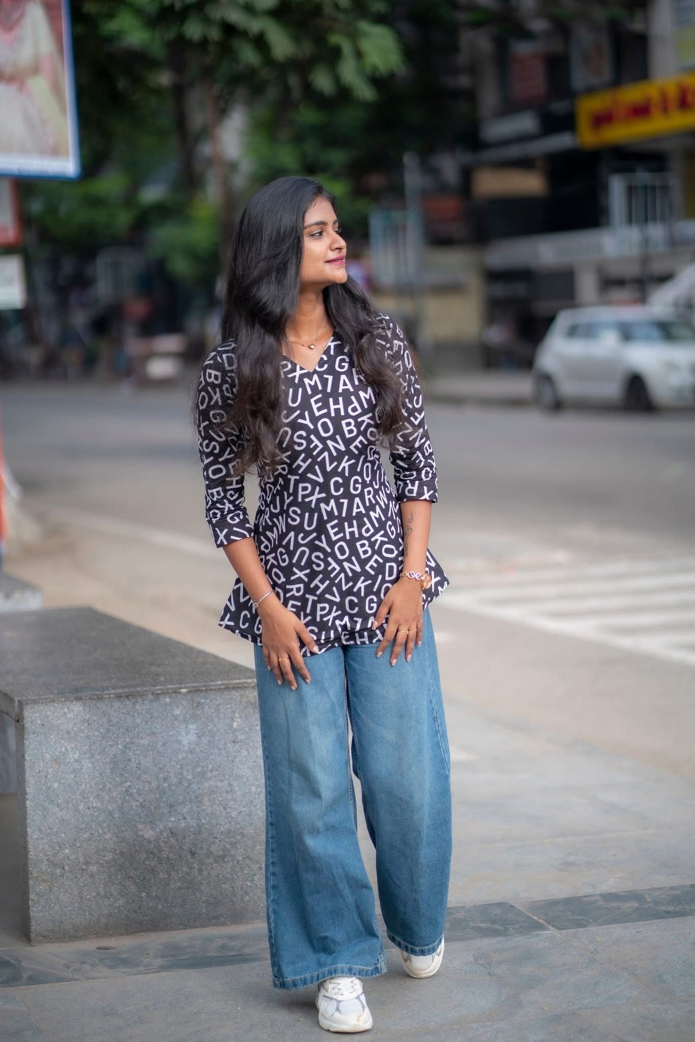 This isn’t just a top - it’s a blockbuster in fabric! With bold black tones and random letter prints, it brings out your inner dialogue queen with punch lines like “Enaku oru feel varudhu…” Perfect for the girl who walks like she’s in slow-motion with BGM, this short top is made for those who live life, cine-style! Team it up with flared jeans, you’ve got a vibe that’s vera level and your favorite dialogue is - fashion is temporary, but style is always “Therikka Vidalama!”