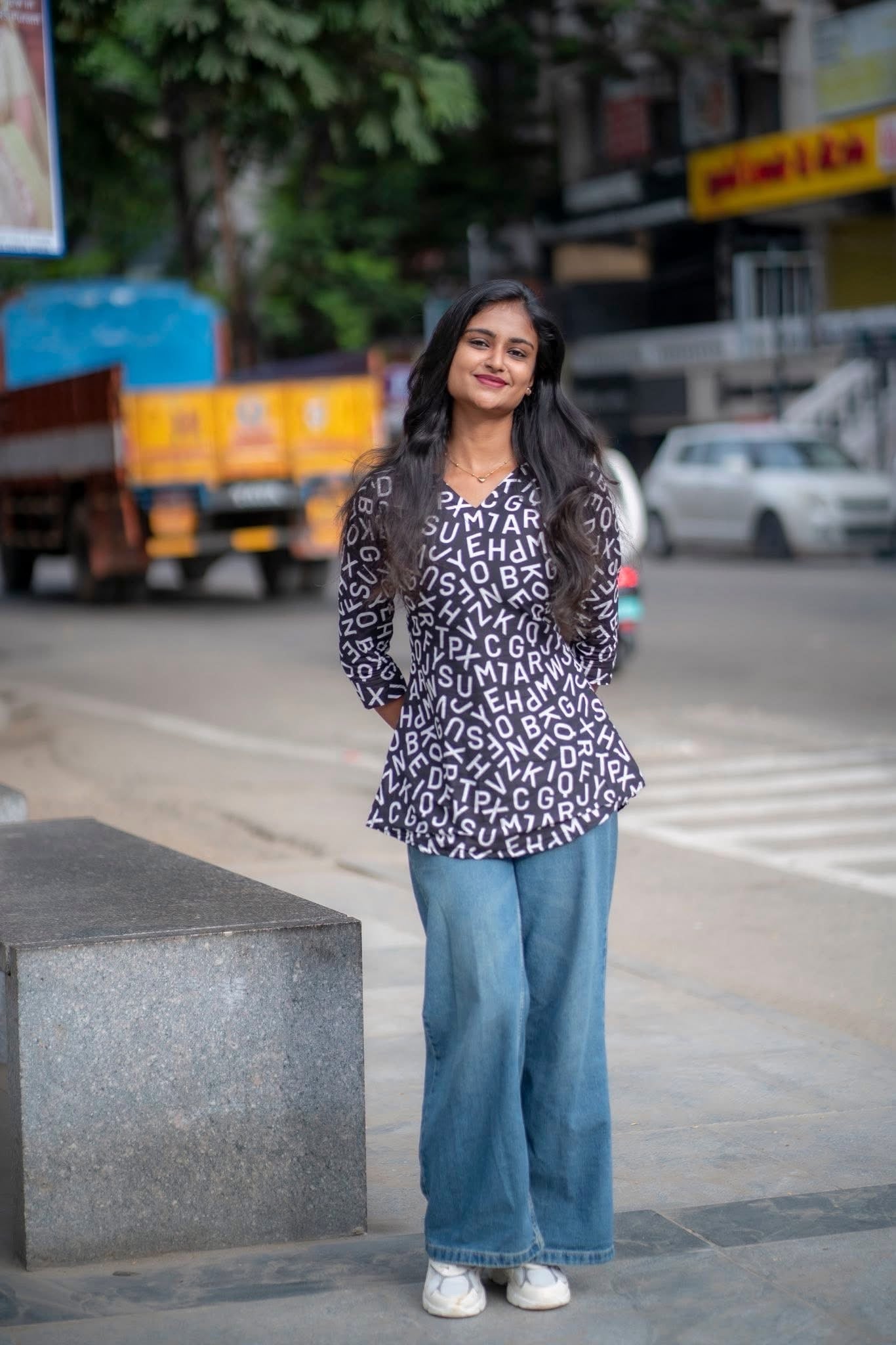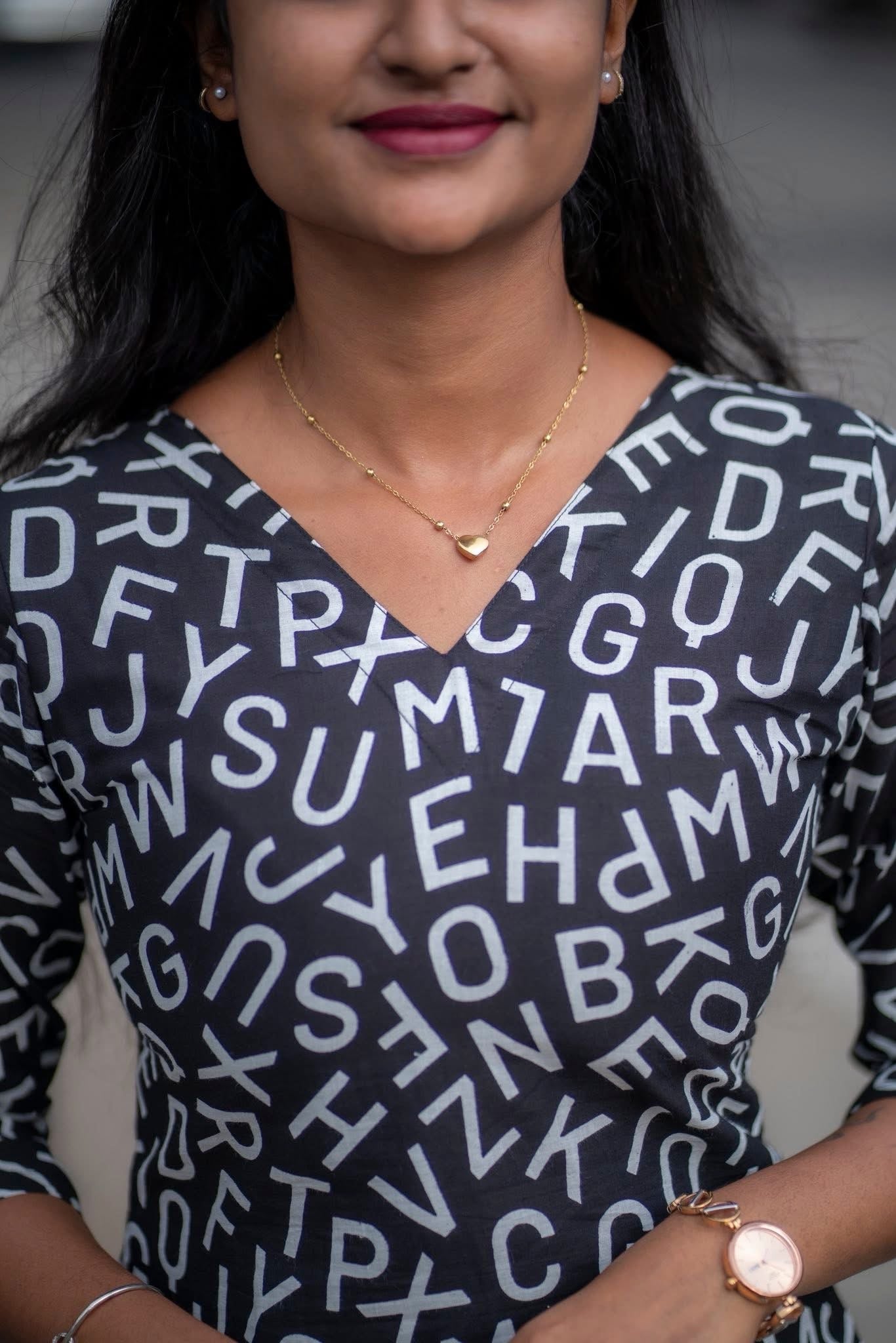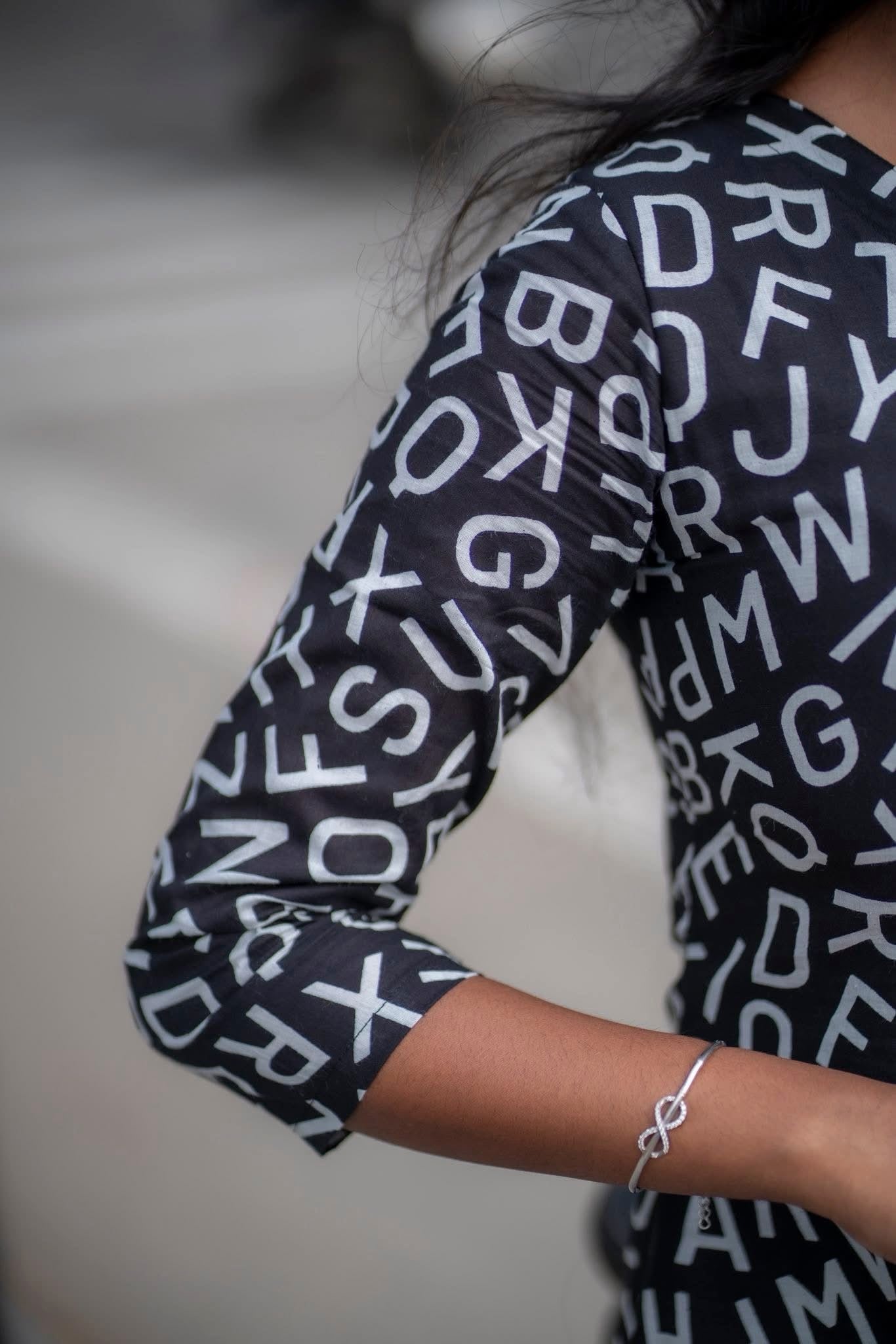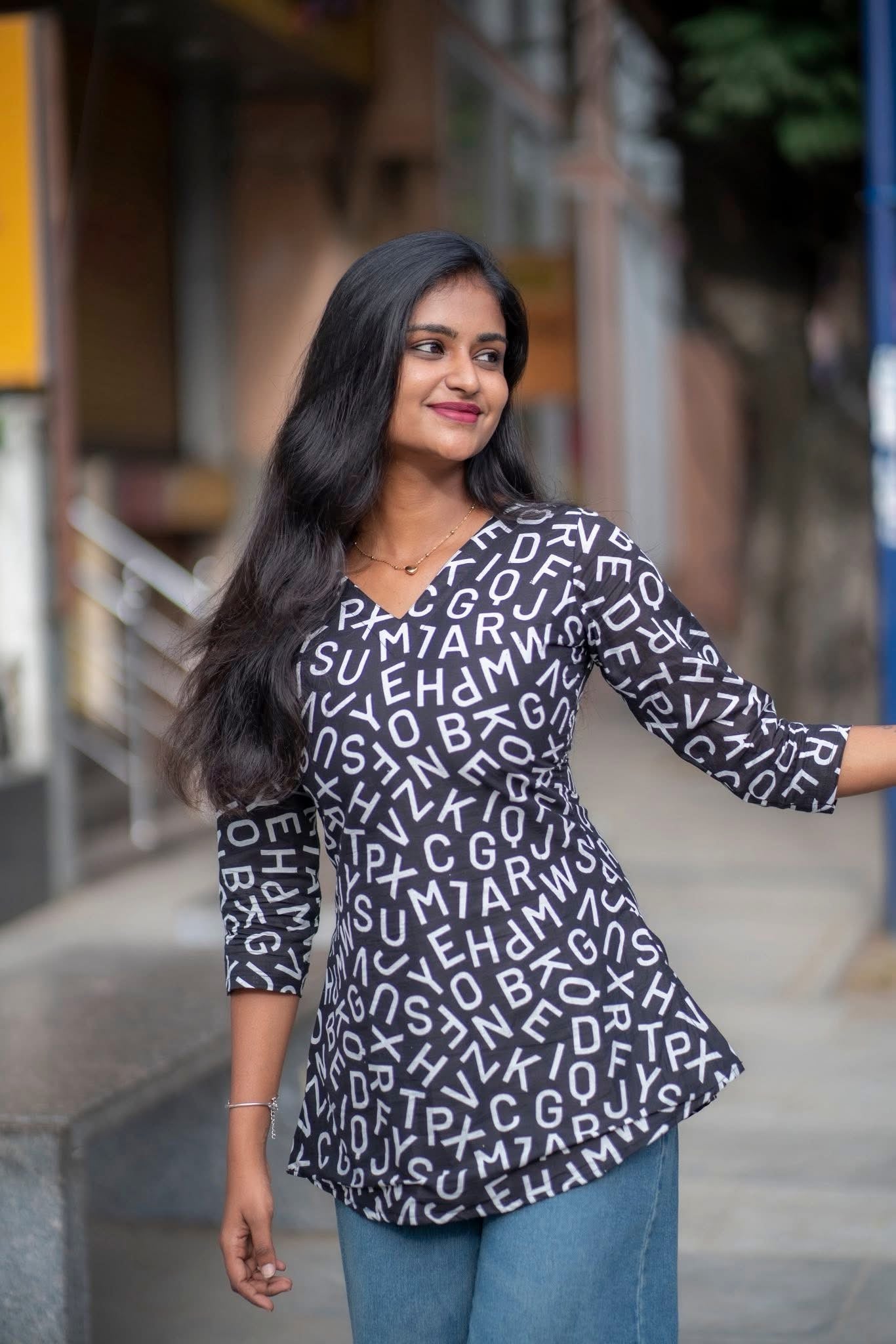 This isn’t just a top - it’s a blockbuster in fabric! With bold black tones and random letter prints, it brings out your inner dialogue queen with punch lines like “Enaku oru feel varudhu…” Perfect for the girl who walks like she’s in slow-motion with BGM, this short top is made for those who live life, cine-style! Team it up with flared jeans, you’ve got a vibe that’s vera level and your favorite dialogue is - fashion is temporary, but style is always “Therikka Vidalama!”